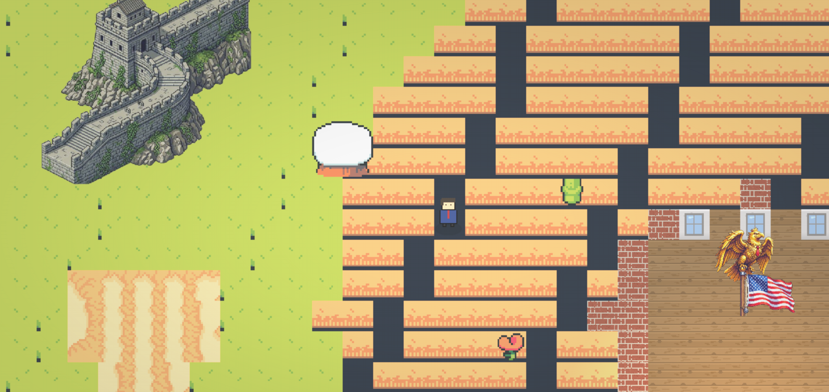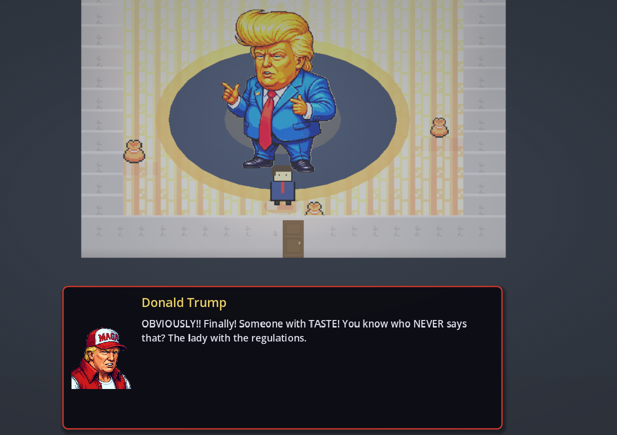 You play as a broke, exhausted citizen trying to renew a passport in a world ruled by bureaucracy, spectacle, corporate ego, and geopolitical absurdity. The game blends retro 16-bit moods, CRT-era distortion, and caricature-driven encounters into a compact interactive parody of contemporary power.